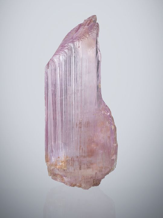 Tento krystal kunzitu je velmi čistý, průsvitný s jemně růžovofialovou bravou, má krásné mnohačetné ukončení a lesklý sametový povrch.